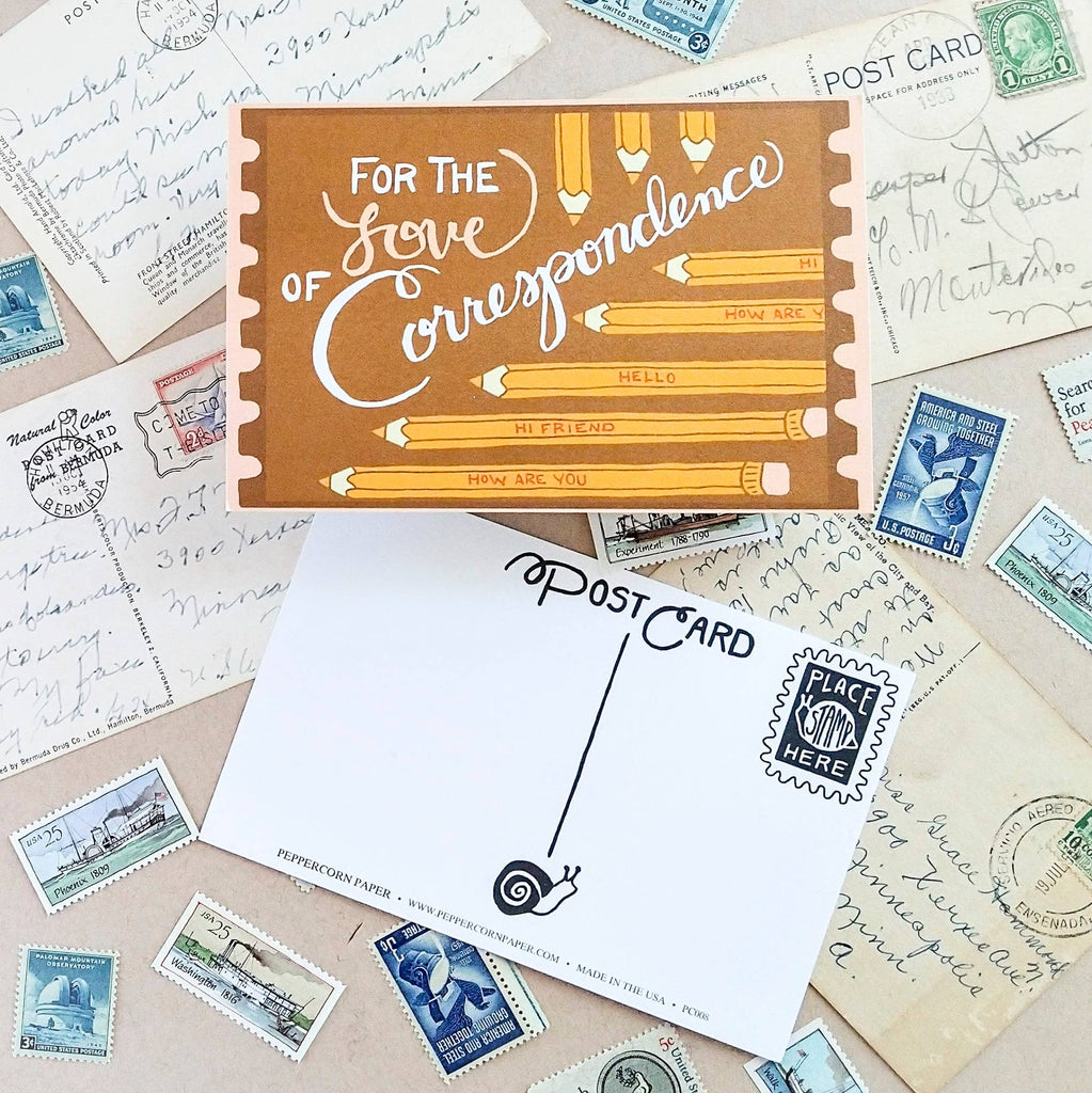 This fun postcard is all about the love of writing. For the love of correspondence is a great postcard for those who have penpals or just love sending snail mail.