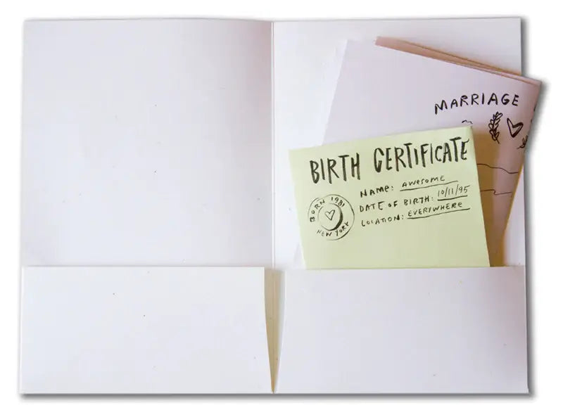 6" x 9" white speckled paper, foil stamped in gold foil and contains two inner pockets that fit 5.5" x 8.5" sheets of really important shit with ease.