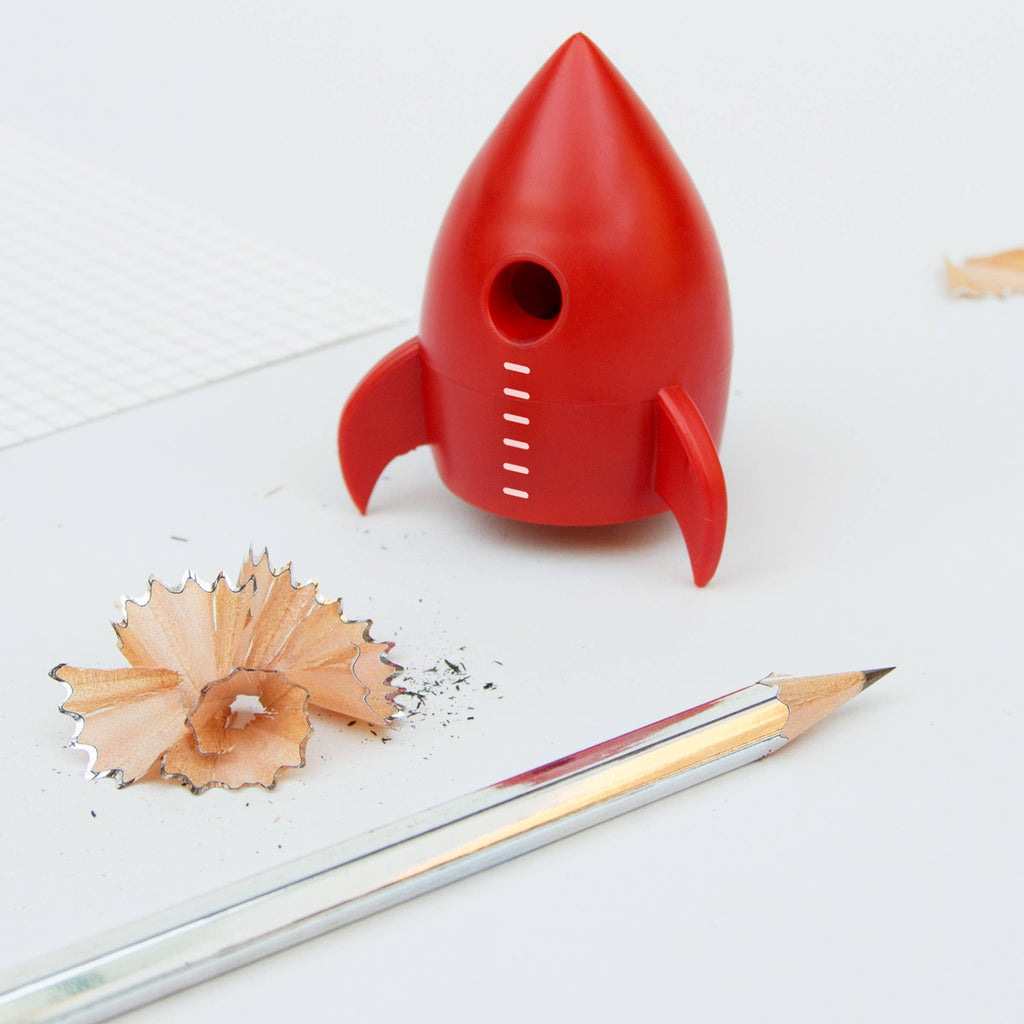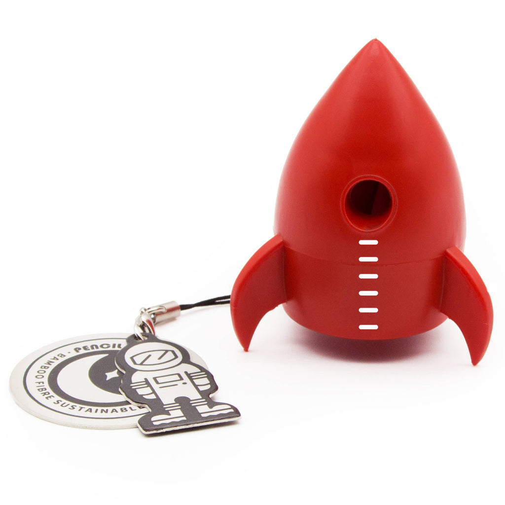 Bright red and ready for lift off, this free-standing rocket-shaped pencil sharpener will make a welcome addition to any desk or pencil case. Made from sustainable bamboo fiber with a moon and astronaut tag.