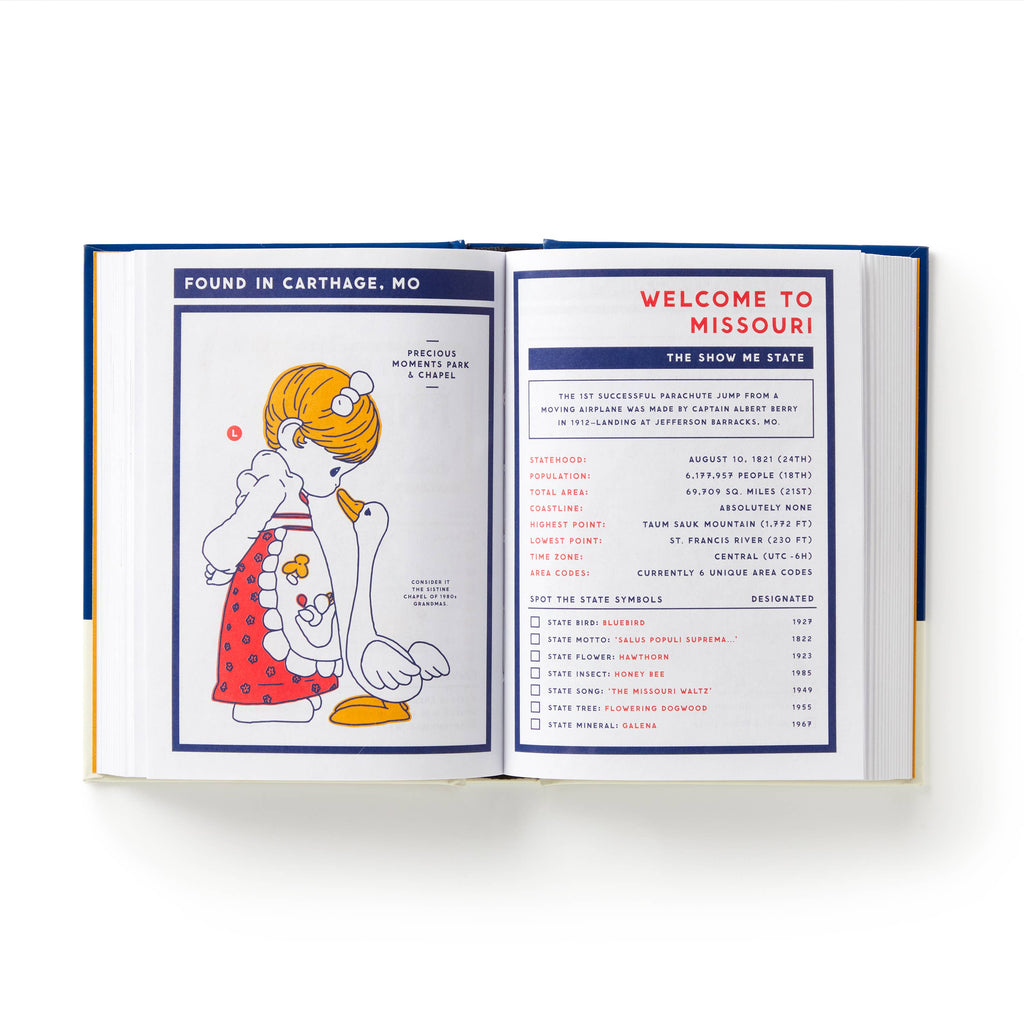 Any old travel guide can tell you about the Grand Canyon in Arizona, but what about Joann’s Gum Wrapper Museum that’s in a pink shed behind her house? This handy guide will point out the best (and strangest) attractions in all 50 states with plenty of space to map and journal your adventures to everything from National Parks to small town tourist traps. Features a spot varnished hardcover and 417 unique pages of attractions. The book features wonderful illustrations and detailed descriptions of all the must-see sights and hidden gems in each state, from national parks to local landmarks.