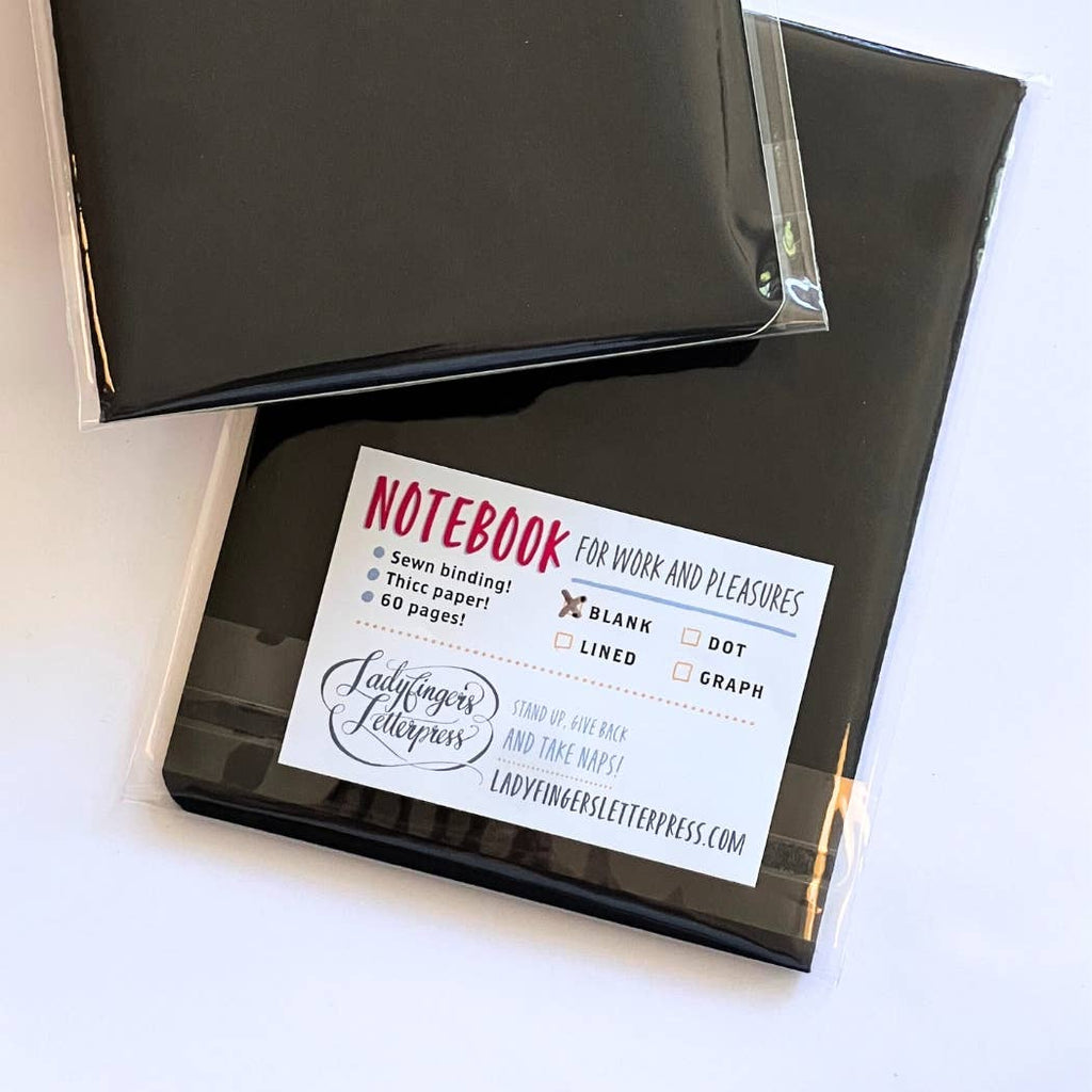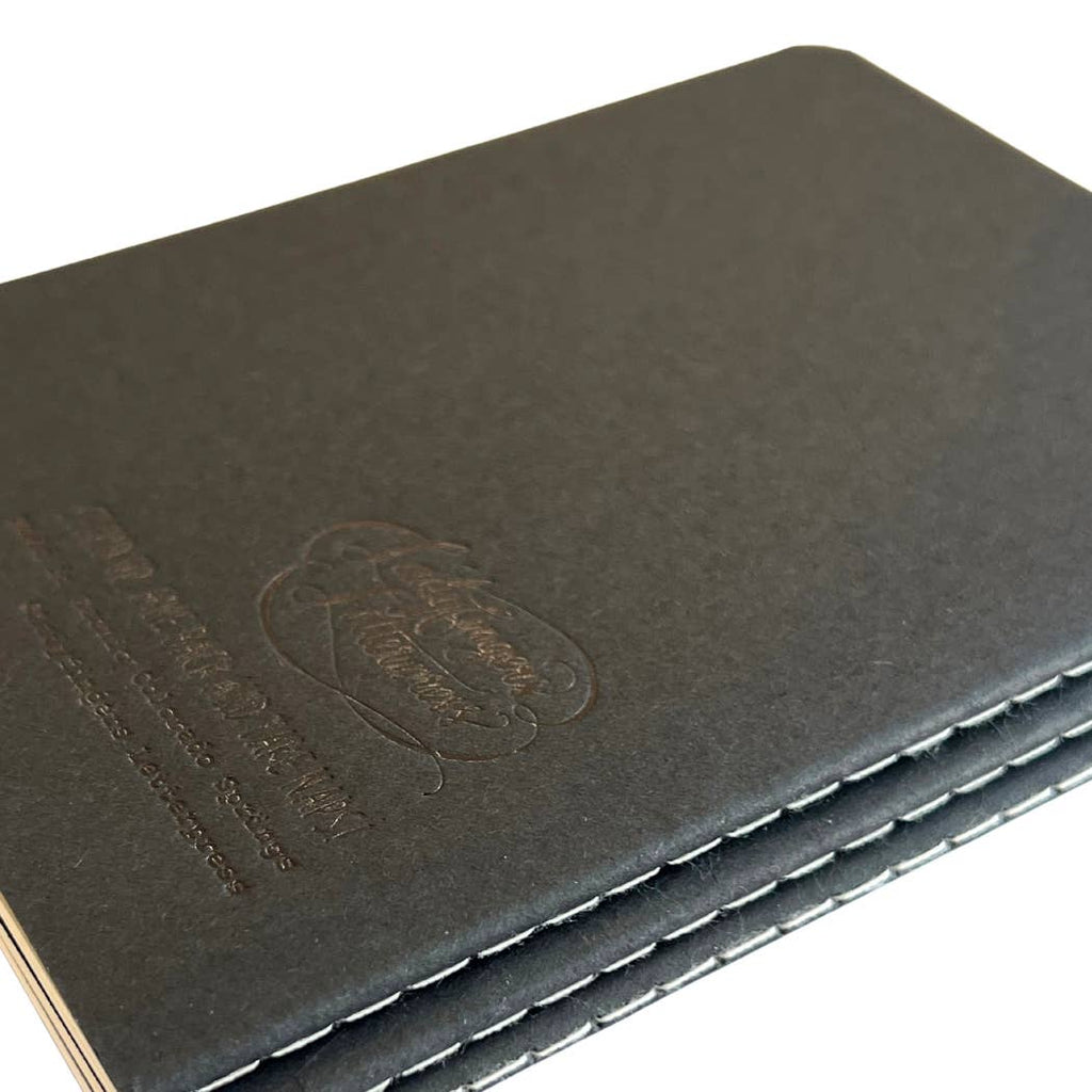 Feeling disorganized because you keep scribbling your to-do lists on random scraps of paper that inevitably get lost in your piles of crap on your desk? Or is that just me? Well, we have a solution for you whether you’re a completely disheveled mess or just feeling uninspired by your boring-ass basic notebooks! These babies are foil-stamped on a 120-year-old press with sewn bindings! They’re also clever enough that they might inspire you to get your act together and organize your thoughts in one place. Back of notebook has Ladyfingers Letterpress Logo in Black foil.