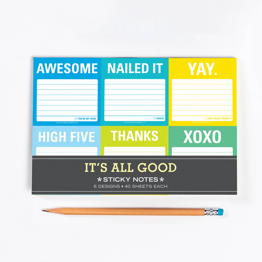 The It's All Good Sticky Note Packet combines your love of stickies, fun office gifts, and tidy packages – all in one slick little folio. Armed with a sticky pad for every awe-inspiring occasion, you'll find it easy to keep it real (organized). Say "you're awesome" with stickies!