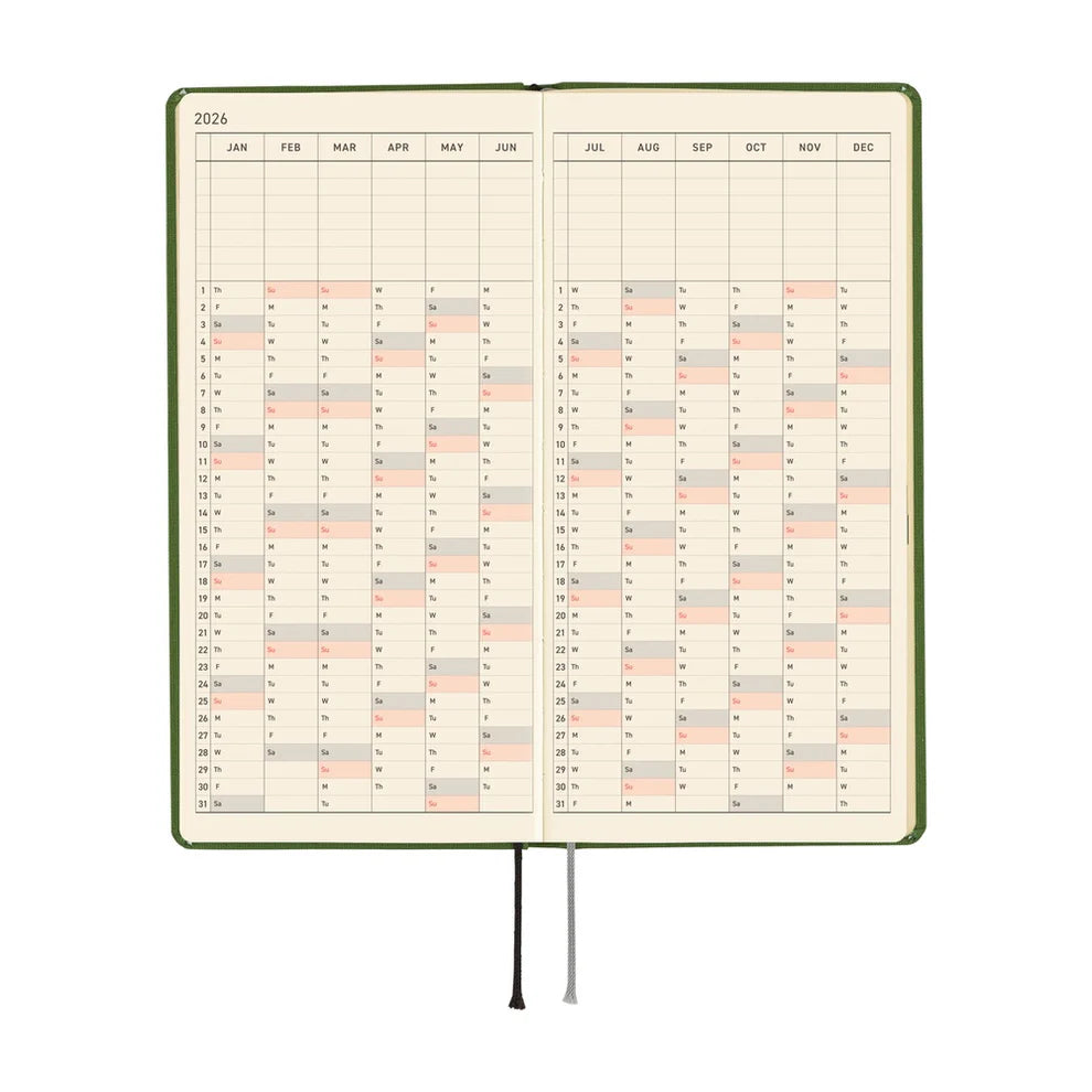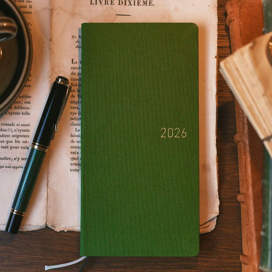 The Colors series for Weeks offers users elegantly crafted color schemes, featuring sturdy bookbinding and a tactile cover fabric. Each color is meticulously chosen to align with the current year's trends, complemented by a carefully selected foil-pressed design for 2026 that harmonizes with the background hue. The cover is designed as a lightweight hardcover, allowing for flexibility while maintaining durability.