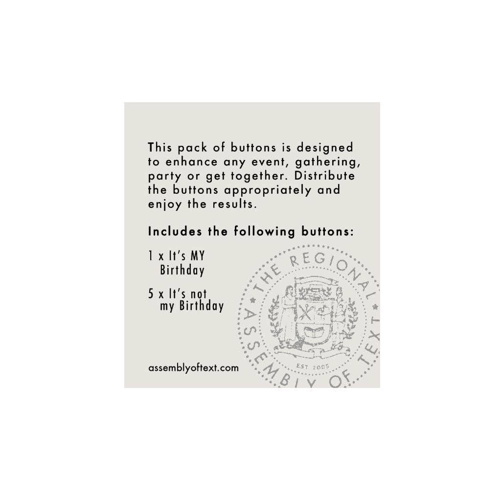 This silly pack of party pins contains 1 button that reads "It's MY Birthday" and 5 other buttons that read " It's not my birthday". Buttons vary in size. Set measures approximately 3” x 6½”.